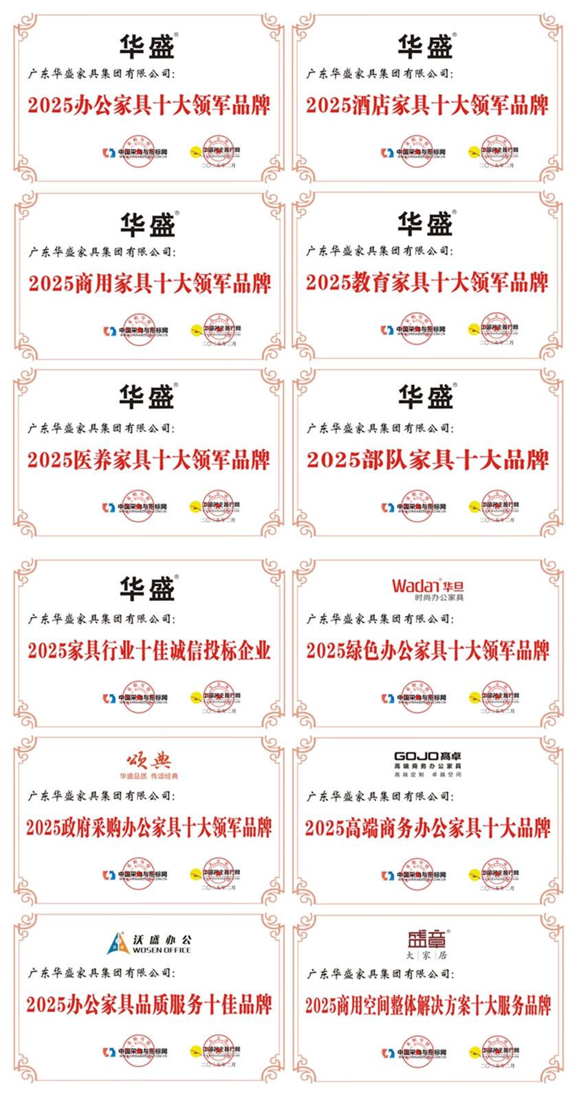 近日,在由中国采购与招标网、中国名企排行网联合举办的“2025(第15届)家具招标采购评价推介”活动中,广东华盛家具集团有限公司(以下简称“华盛家具”)一举获得“2025办公家具十大领军品牌”“2025家具行业十佳诚信投标企业”“2025绿色办公家具十大领军品牌(华旦)”“2025办公家具品质服务十佳品牌(沃盛)”“2025政府采购办公家具十大领军品牌(颂典)”“2025商用家具十大领军品牌”“2025高端商务办公家具十大品牌(高卓)”“2025教育家具十大领军品牌”“2025医养家具十大领军品牌”“2025酒店家具十大领军品牌”“2025部队家具十大品牌”“2025商用空间整体解决方案十大服务品牌(盛章)”等12项荣誉。