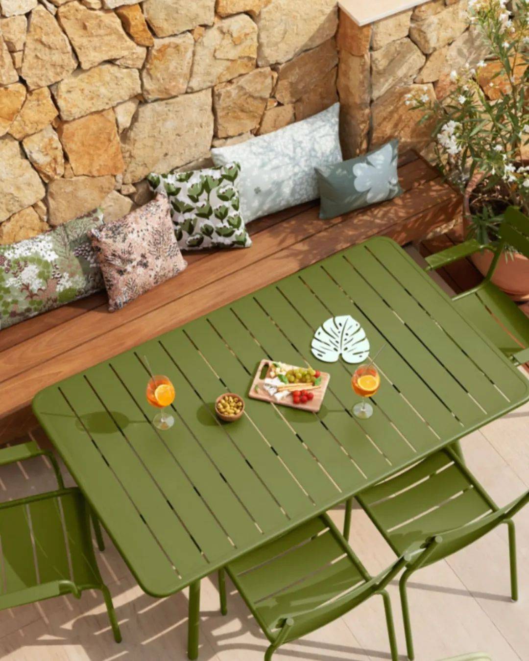 Fermob是色彩美学的极致表达者,其最大的品牌特征在于其鲜明的色彩哲学。该品牌提供多达25种标准色彩选择(如芥末黄、鼠尾草绿、深海蓝、番茄红等),所有颜色都基于自然与季节灵感开发,并通过户外专用的高耐候粉末涂层上色,具有抗紫外线、不易褪色、防锈等特点。这一丰富的色彩体系使 Fermob 的家具不仅是实用品,更是空间氛围的塑造者。