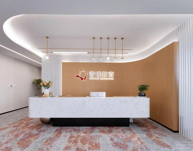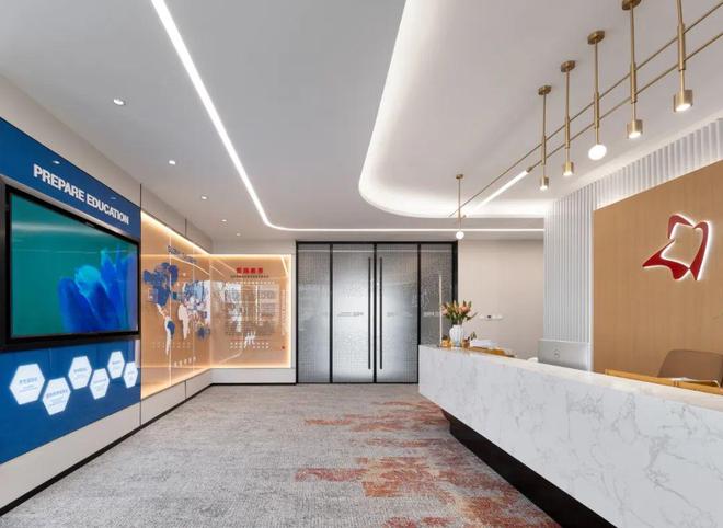 前厅文化展示墙,设计融合实用性与艺术审美,通过色彩、图形、文字等多种元素的搭配,展示普瑞教育的发展历程,全球分布,文化理念与工作成果。营造出一种强烈的视觉冲击力和情感共鸣,吸引访客的目光与关注,彰显企业文化与实力。