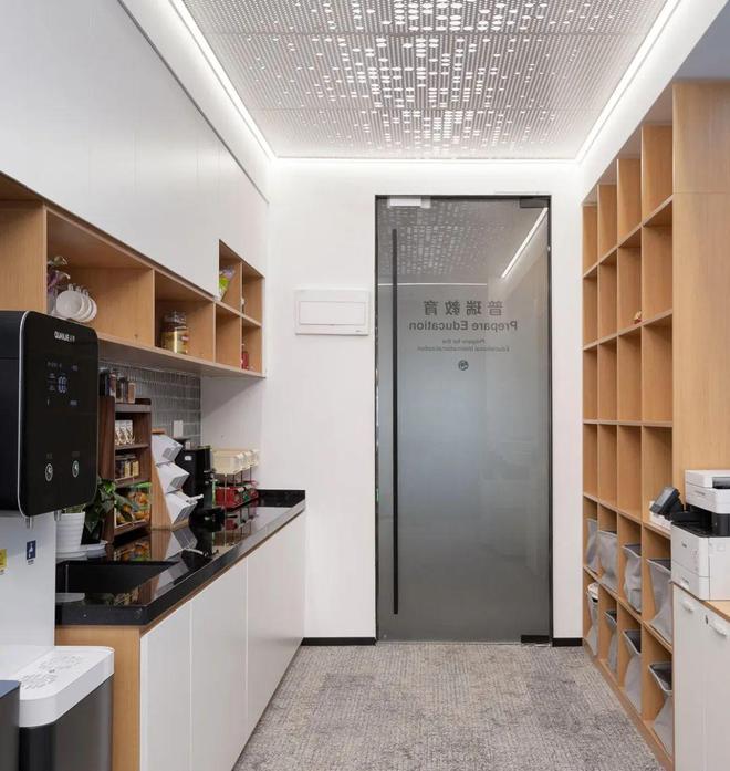茶水文印区为员工提供饮水,咖啡,零食,收纳储物,小憩交流,文件打印等多种功能。空间氛围的营造上,网格状的天花结构中,嵌入星星点点的灯光,搭配蓝色的壁纸,在有限的空间中营造出无限延伸的视觉效果,使整个空间浪漫轻松,增强了员工的认同和归属感。