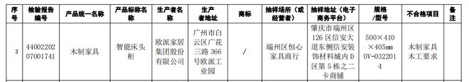 不合格产品信息显示,1批次欧派家居集团股份有限公司生产的、在端州区恒心家具商行销售的智能床头柜被抽检出“木制家具木工要求”项目不合格。