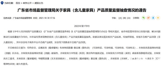 10月30日,广东省市场监管局公布家具(含儿童家具)产品质量监督抽查情况公告,有33款产品被检测为不合格。其中,1批次欧派的智能床头柜被检出“木制家具木工要求”项目不合格。
