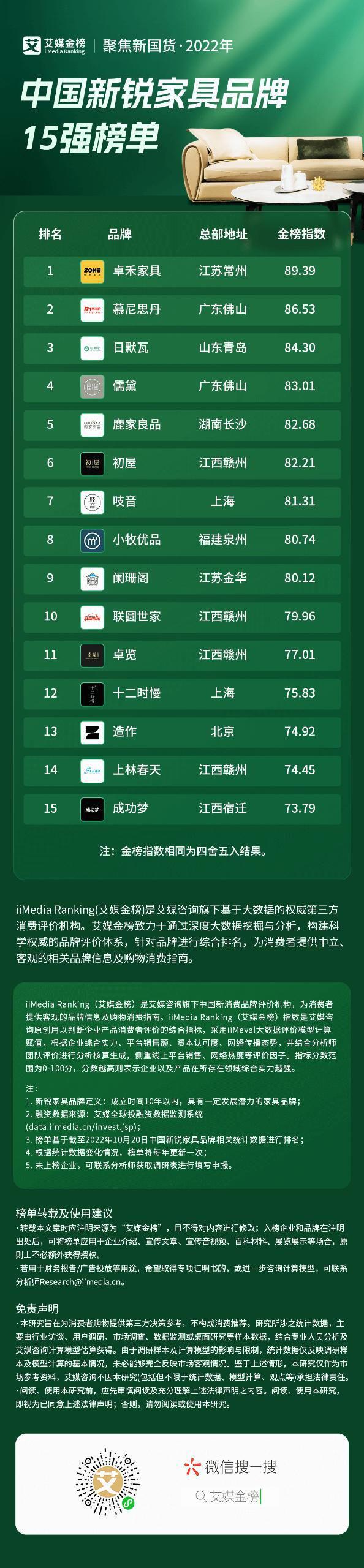 本次上榜的新锐家具品牌包括:卓禾家具、慕尼思丹、日默瓦、儒黛、鹿家良品、初屋、吱音、小牧优品、阑珊阁、联圆世家、尊龙人生就是博d88卓览、十二时慢、造作、上林春天、成功梦。其中,卓禾家具(89.39)、慕尼思丹(86.53)、尊龙人生就是博d88日默瓦(84.30)依次位列榜单前三名。