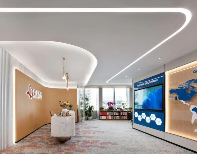 前厅文化展示墙,设计融合实用性与艺术审美,通过色彩、图形、文字等多种元素的搭配,展示普瑞教育的发展历程,全球分布,文化理念与工作成果。营造出一种强烈的视觉冲击力和情感共鸣,吸引访客的目光与关注,彰显企业文化与实力。