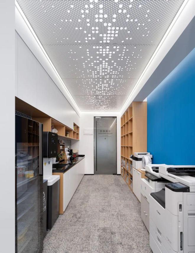 茶水文印区为员工提供饮水,咖啡,零食,收纳储物,小憩交流,文件打印等多种功能。空间氛围的营造上,网格状的天花结构中,嵌入星星点点的灯光,搭配蓝色的壁纸,在有限的空间中营造出无限延伸的视觉效果,使整个空间浪漫轻松,增强了员工的认同和归属感。