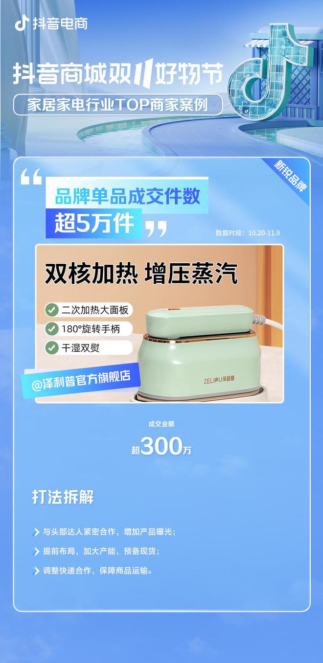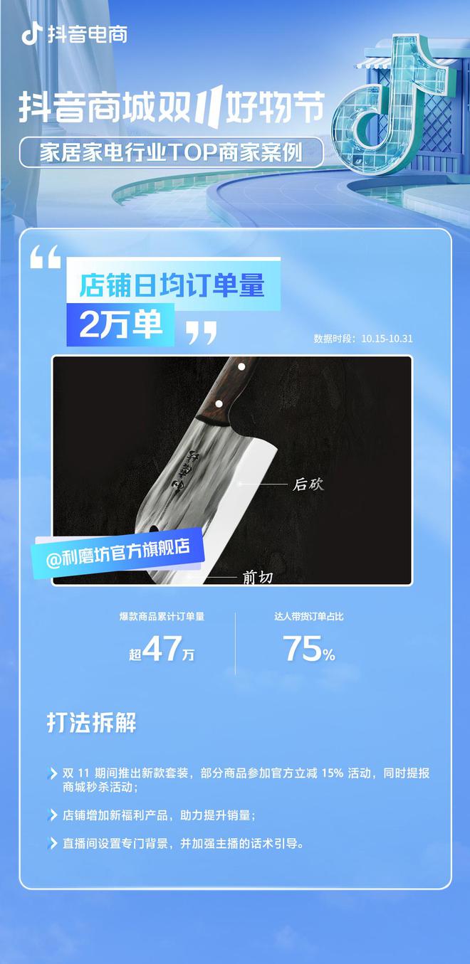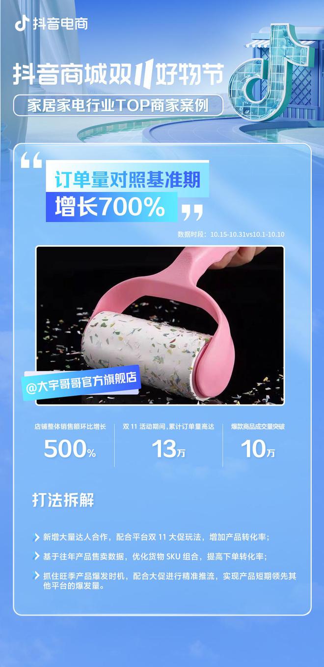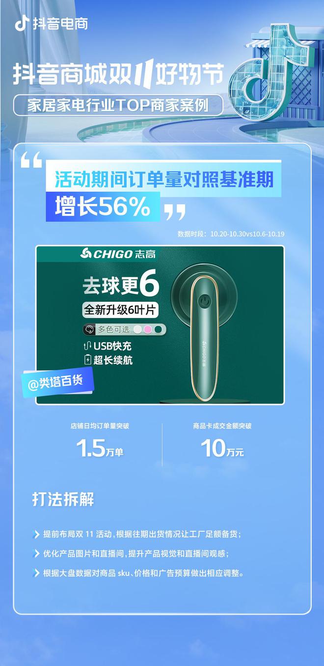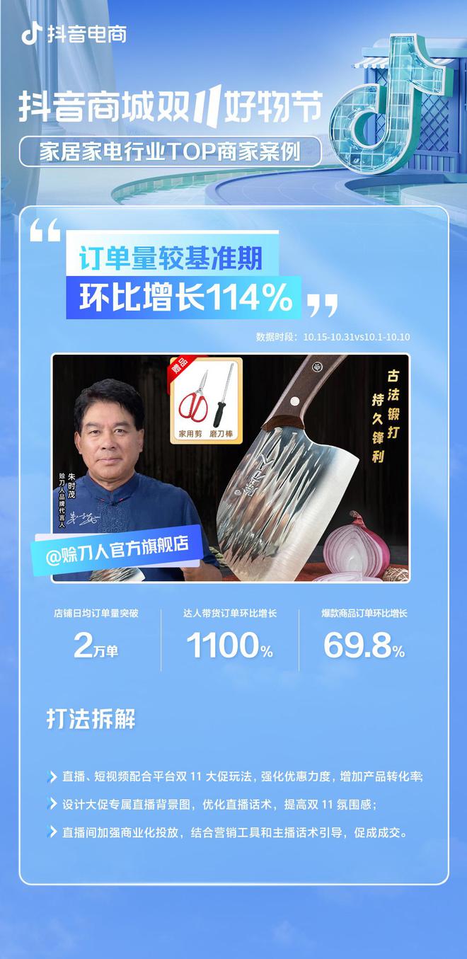 依托全域兴趣电商优势,诸多家居家电商家借势双11消费热潮,取得了优异的成绩,这再次证明了抖音电商助力商家在大促期间实现生意爆发的优势和能力。